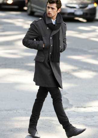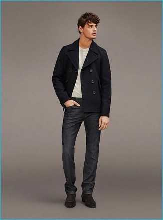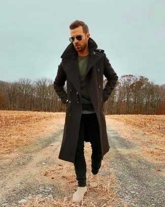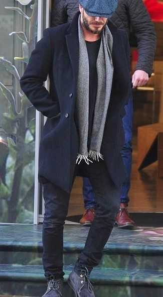 Темно-серая футболка с длинным рукавом СохранитьУдалитьТемно-коричневое длинное пальто и черные зауженные джинсы будет прекрасным вариантом для легкого образа на каждый день. Бежевые замшевые ботинки великолепно дополнят этот образ.