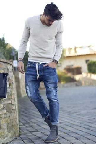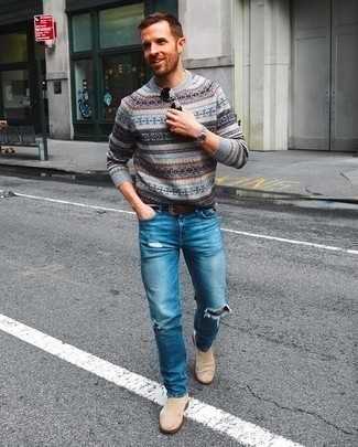 Серый свитер с круглым вырезом с жаккардовым узором СохранитьУдалитьСочетание серого свитера с круглым вырезом с жаккардовым узором и синих рваных джинсов — самый простой из возможных образов для активного досуга. Весьма выгодно здесь будут выглядеть бежевые замшевые ботинки.