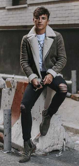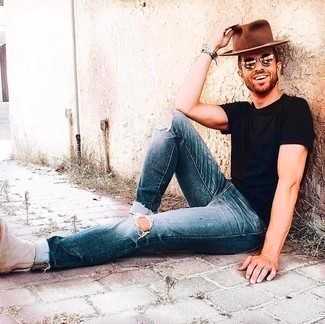 Бежевые замшевые ботинки челси СохранитьУдалитьЕсли ты запланировал суматошный день, сочетание черной футболки с круглым вырезом и темно-синих рваных джинсов позволит создать удобный образ в непринужденном стиле. Дополнив ансамбль бежевыми замшевыми ботинками, можно получить неожиданный результат.