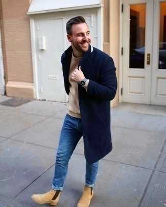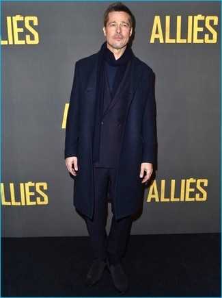 Темно-синее длинное пальто СохранитьУдалитьЕсли ты приписываешь себя к той редкой группе джентльменов, разбирающихся в моде, тебе понравится ансамбль из темно-синего длинного пальто и синих джинсов. Пара бежевых замшевых ботинок отлично гармонирует с остальными элементами лука.