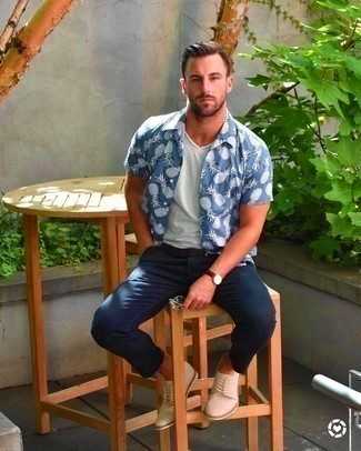 Бежевые замшевые ботинки дезерты СохранитьУдалитьВ тандеме друг с другом синяя рубашка с коротким рукавом с принтом и темно-синие брюки чинос выглядят наиболее удачно. Любители свежих идей могут дополнить лук бежевыми замшевыми ботинками, тем самым добавив в него чуточку изысканности.