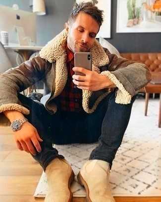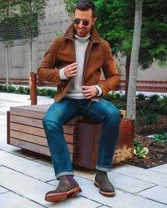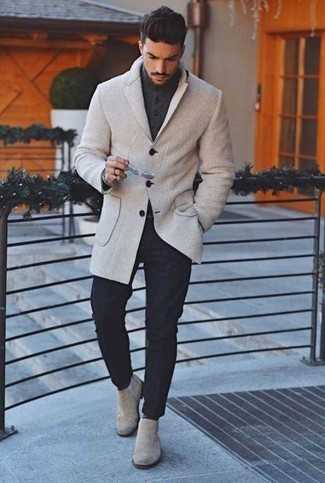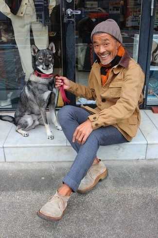 Бежевые замшевые ботинки челси СохранитьУдалитьКоричневая куртка с воротником и на пуговицах и темно-синие шерстяные брюки чинос — обязательные вещи в гардеробе стильного джентльмена. В сочетании с бежевыми замшевыми ботинками такой лук выглядит особенно удачно.