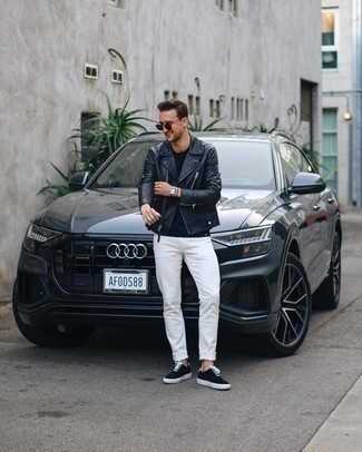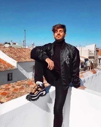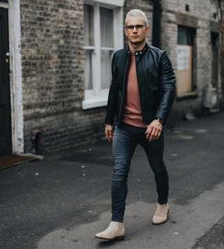 Черный кожаный бомбер СохранитьУдалитьКомбо из черного кожаного бомбера и черных зауженных джинсов без сомнений будет привлекать взоры прекрасного пола. Думаешь привнести в этот образ толику строгости? Тогда в качестве дополнения к этому образу, стоит выбрать бежевые замшевые ботинки.