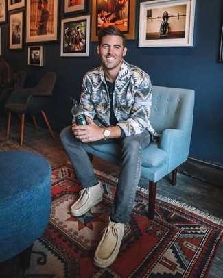 Бежевые замшевые ботинки дезерты СохранитьУдалитьВыбирая ансамбль для вечера в кино или кафе с девушкой, обрати внимание на образ из серой куртки-рубашки с принтом и серых джинсов. Не прочь привнести в этот наряд толику утонченности? Тогда в качестве дополнения к этому ансамблю, стоит выбрать бежевые замшевые ботинки.