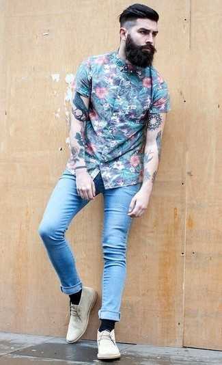 Бежевые замшевые ботинки дезерты СохранитьУдалитьЕсли у тебя планируется суматошный день, сочетание синей рубашки с коротким рукавом с цветочным принтом и голубых зауженных джинсов поможет составить практичный ансамбль в повседневном стиле. Не прочь добавить сюда немного классики? Тогда в качестве дополнения к этому образу, стоит обратить внимание на бежевые замшевые ботинки.