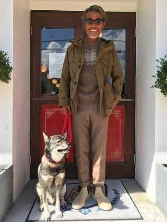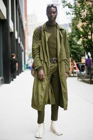 Бежевые замшевые ботинки челси СохранитьУдалитьНесмотря на то, что это классический образ, сочетание оливкового плаща и оливковых классических брюк всегда будет нравиться джентльменам, покоряя при этом сердца барышень. Если тебе нравится более удобная обувь, останови свой выбор на бежевых замшевых ботинках.