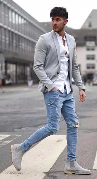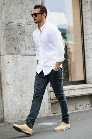 Бежевые замшевые ботинки челси СохранитьУдалитьЛюбителям непринужденного стиля придется по душе образ из белой классической рубашки и темно-серых зауженных джинсов. Если ты любишь использовать в своих образах разные стили, из обуви можешь надеть бежевые замшевые ботинки.