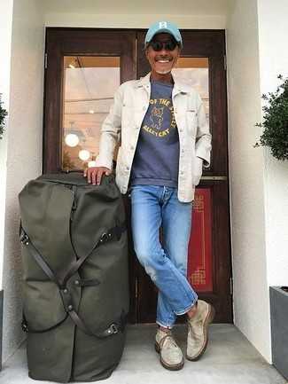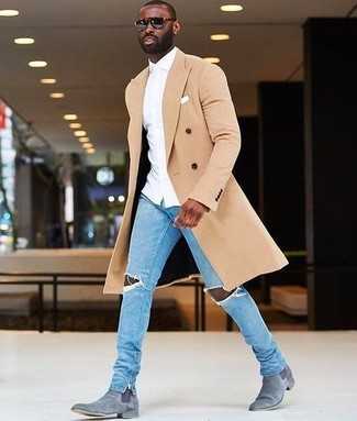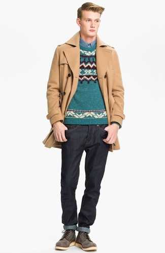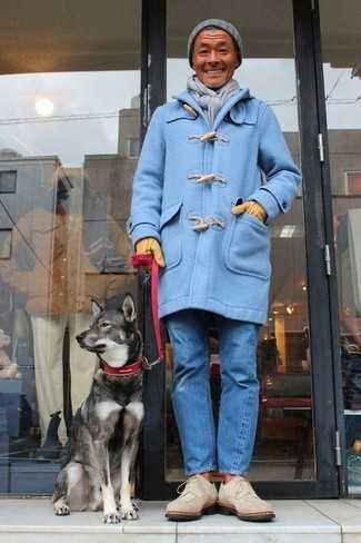 Бежевые замшевые ботинки дезерты СохранитьУдалитьЕсли ты приписываешь себя к той немногочисленной категории мужчин, разбирающихся в одежде, тебе придется по вкусу лук из голубого дафлкота и синих джинсов. Бежевые замшевые ботинки прекрасно впишутся в лук.