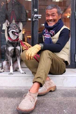 Темно-синий свитер с круглым вырезом СохранитьУдалитьБежевая стеганая куртка без рукавов и оливковые брюки чинос — прекрасная идея для простого, но стильного мужского образа. Думаешь добавить в этот лук толику утонченности? Тогда в качестве обуви к этому луку, выбирай бежевые замшевые ботинки.