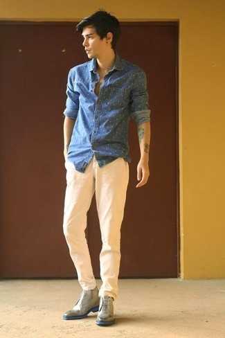 Серые кожаные ботинки дезерты СохранитьУдалитьАнсамбль из синей джинсовой рубашки в горошек и бежевых брюк чинос как нельзя лучше подчеркнет твою мужественность. Если ты предпочитаешь смелые решения в своих образах, заверши этот темно-серыми кожаными ботинками.