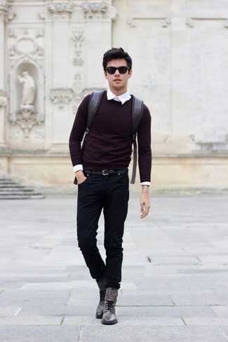 Серые кожаные повседневные ботинки СохранитьУдалитьТемно-красный свитер с круглым вырезом в паре с черными джинсами — отличная идея для воплощения мужского образа в элегантно-деловом стиле. Любишь экспериментировать? Дополни ансамбль темно-серыми кожаными ботинками.