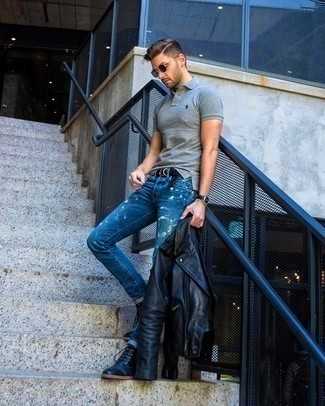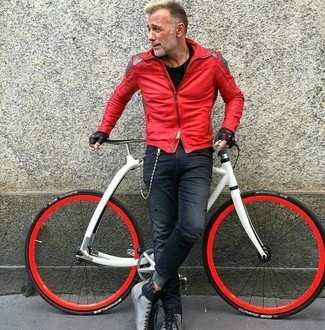 Серые кожаные повседневные ботинки СохранитьУдалитьСочетание красной кожаной косухи и темно-синих рваных зауженных джинсов особенно популярно среди ценителей комфортных ансамблей. Любители свежих идей могут завершить образ темно-серыми кожаными ботинками, тем самым добавив в него немного классики.