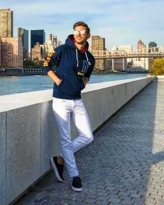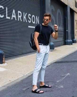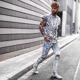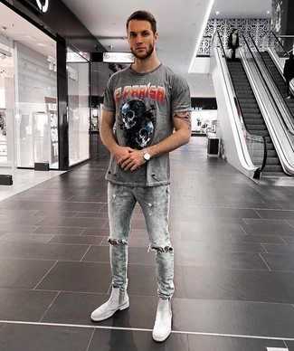 Серебряные кожаные ботинки челси СохранитьУдалитьСтильное сочетание бело-черной футболки с круглым вырезом с принтом и голубых рваных зауженных джинсов подойдет для тех случаев, когда комфорт ценится превыше всего. Не прочь сделать образ немного строже? Тогда в качестве обуви к этому образу, обрати внимание на темно-серые кожаные ботинки.