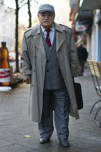 Серые кожаные ботинки челси СохранитьУдалитьНесмотря на то, что это весьма консервативный лук, дуэт серого плаща и серых классических брюк является постоянным выбором стильных молодых людей, пленяя при этом сердца прекрасных дам. Чтобы привнести в ансамбль немного беззаботства , на ноги можно надеть темно-серые кожаные ботинки.