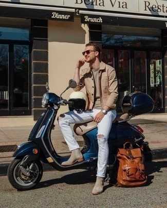 Темно-коричневые солнцезащитные очки СохранитьУдалитьДуэт светло-коричневой куртки-рубашки и белых рваных джинсов поможет создать нескучный мужской образ в повседневном стиле. Думаешь добавить в этот ансамбль толику классики? Тогда в качестве дополнения к этому луку, стоит обратить внимание на серые ботинки челси.