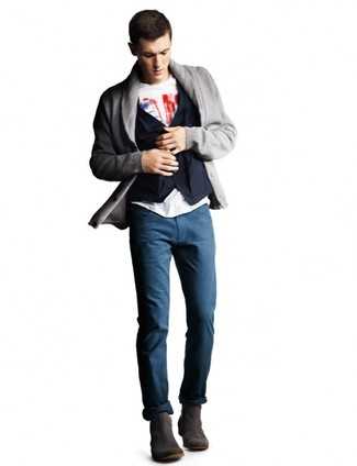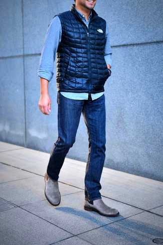 Серые замшевые ботинки челси СохранитьУдалитьОбраз из темно-синей стеганой куртки без рукавов и темно-синих джинсов как нельзя лучше подчеркнет твой индивидуальный стиль. Не прочь привнести в этот ансамбль немного классики? Тогда в качестве обуви к этому луку, обрати внимание на серые ботинки челси.