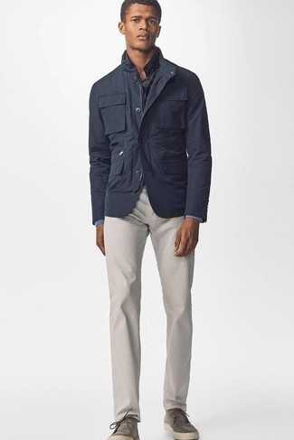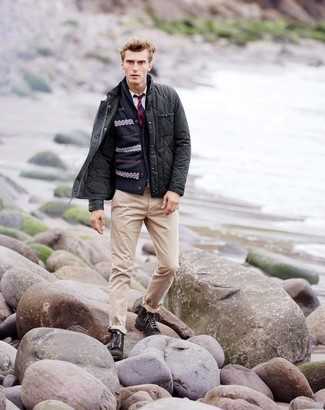 Темно-серая стеганая куртка с воротником и на пуговицах в сочетании с бежевыми брюками чинос — отличный вариант для создания мужского лука в стиле business casual. Любители экспериментов могут завершить образ темно-серыми кожаными ботинками, тем самым добавив в него толику строгости.
