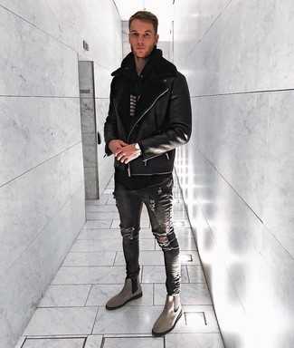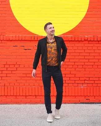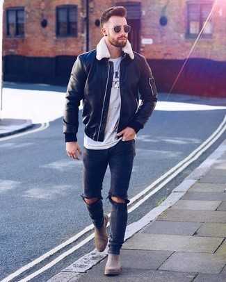 Серые замшевые ботинки челси СохранитьУдалитьСочетание черного замшевого бомбера и черных джинсов однозначно будет обращать на себя внимание красивых женщин. Теперь почему бы не добавить в этот лук на каждый день немного консерватизма с помощью серых ботинок челси?