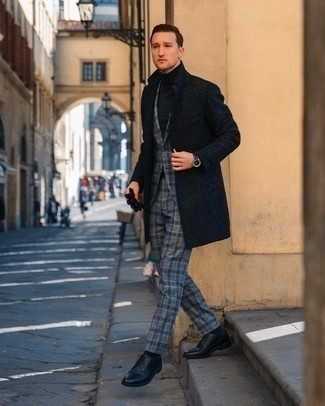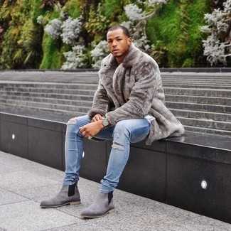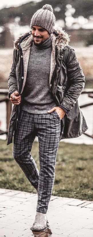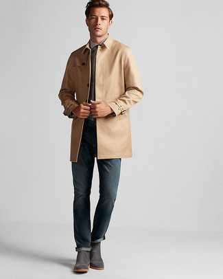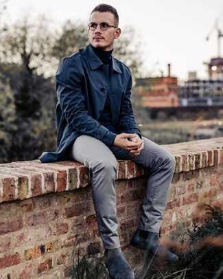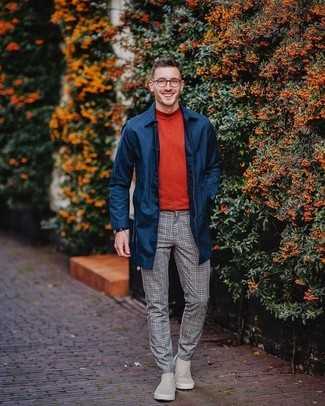 Серые замшевые ботинки челси Если ты принадлежишь к той немногочисленной группе парней, способных разбираться в модных тенденциях, тебе придется по душе образ из темно-синего дождевика и серых шерстяных классических брюк в клетку. И почему бы не привнести в этот лук на каждый день немного стильной строгости с помощью серых ботинок челси?