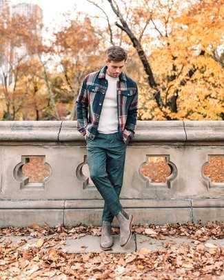 Серые замшевые ботинки челси СохранитьУдалитьНесмотря на то, что этот образ кажется довольно-таки сдержанным, дуэт темно-синей фланелевой куртки-рубашки в шотландскую клетку и темно-синих классических брюк в клетку неизменно нравится джентльменам, покоряя при этом сердца представительниц прекрасного пола. Великолепно сюда подойдут серые ботинки челси.