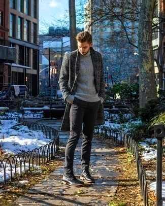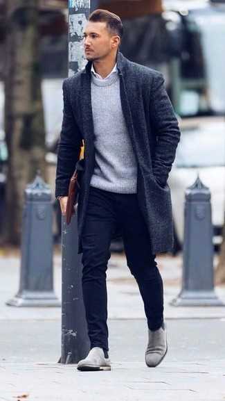 Серые кожаные ботинки челси СохранитьУдалитьНесмотря на то, что этот образ выглядит довольно сдержанно, тандем серого длинного пальто с узором «в ёлочку» и серых классических брюк всегда будет выбором стильных мужчин, покоряя при этом дамские сердца. Этот лук гармонично дополнят темно-серые кожаные ботинки.