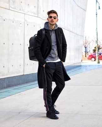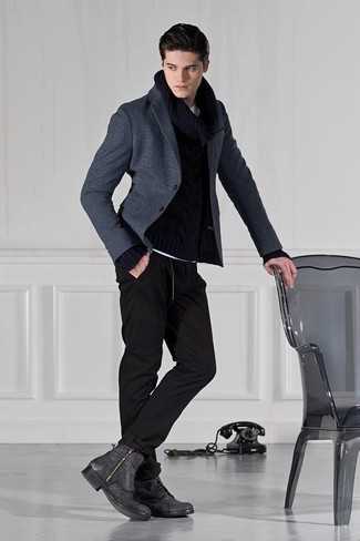 Темно-серые кожаные повседневные ботинки СохранитьУдалитьТемно-серый шерстяной пиджак и черные спортивные штаны великолепно впишутся в мужской лук в повседневном стиле. Любители экспериментов могут завершить лук темно-серыми кожаными ботинками, тем самым добавив в него толику строгости.