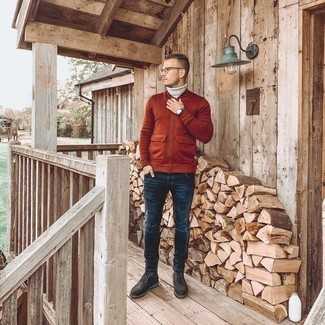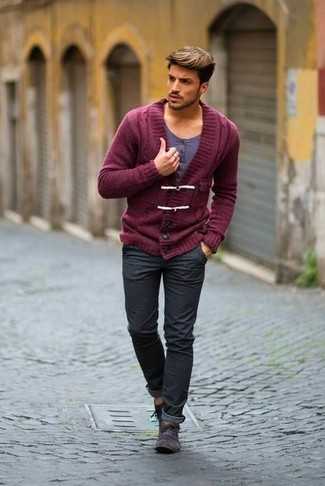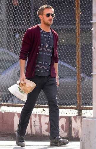 Темно-серые кожаные повседневные ботинки СохранитьУдалитьТемно-красный кардиган и темно-серые джинсы — хороший вариант для барного тура или похода в кино. Не прочь добавить в этот лук немного строгости? Тогда в качестве дополнения к этому ансамблю, стоит обратить внимание на темно-серые кожаные ботинки.