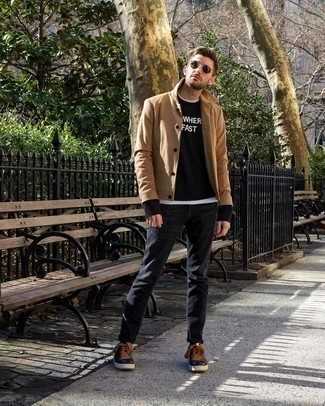Темно-серые кожаные повседневные ботинки СохранитьУдалитьТандем светло-коричневого длинного пальто и черных джинсов поможет выглядеть аккуратно, а также подчеркнуть твой индивидуальный стиль. Темно-серые кожаные ботинки органично впишутся в ансамбль.