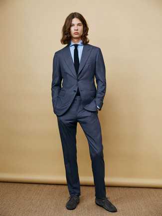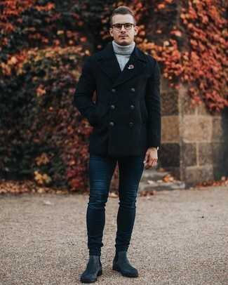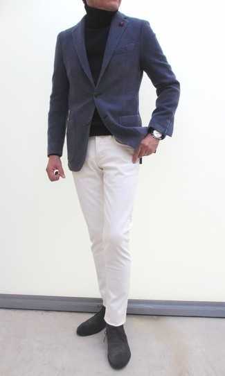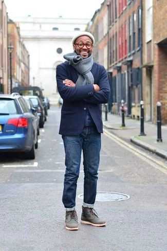 Темно-серые кожаные повседневные ботинки СохранитьУдалитьОбраз из темно-синего шерстяного пиджака и темно-синих джинсов позволит выглядеть модно, но при этом подчеркнуть твой личный стиль. В паре с этим ансамблем наиболее удачно выглядят темно-серые кожаные ботинки.