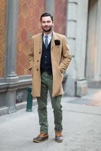 Оливковые брюки чинос СохранитьУдалитьСветло-коричневое длинное пальто в сочетании с оливковыми брюками чинос чудесно подходит для рабочего дня в офисе. Пара темно-серых кожаных ботинок свяжет лук воедино.