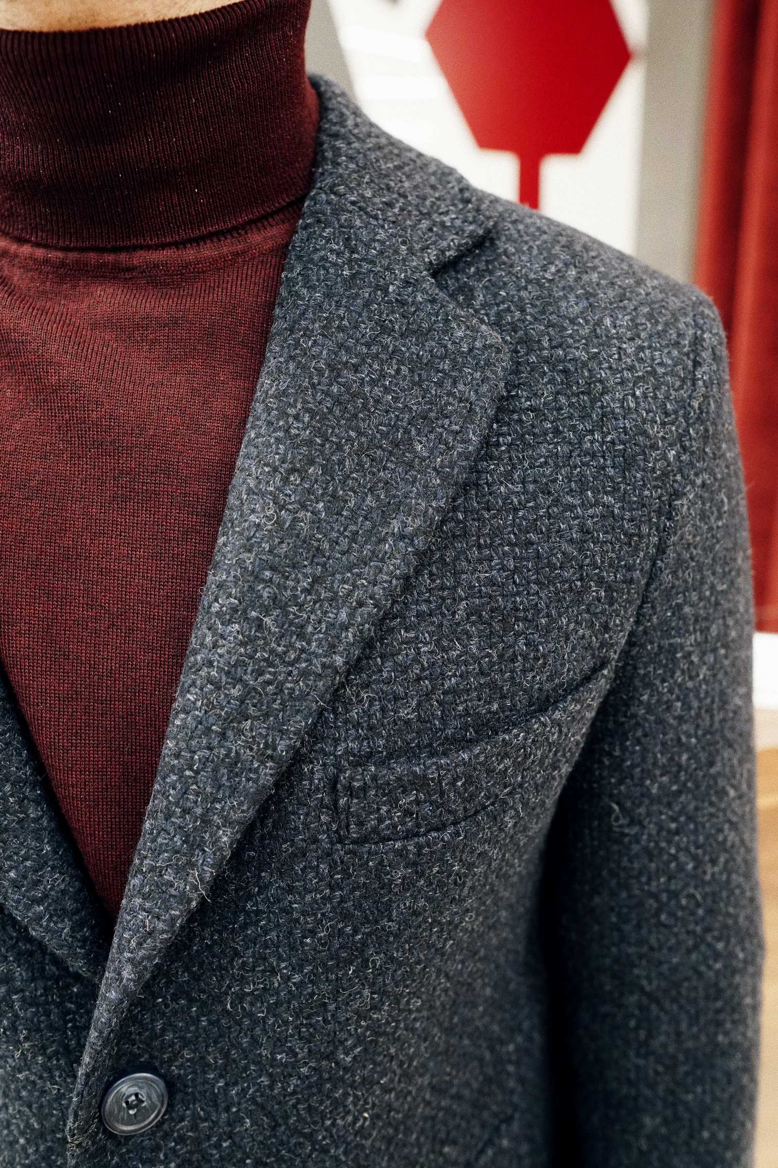 С пиджаком марсала, клетчатым шарфом, твидовыми брюками и коричневыми туфлями