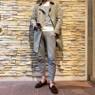 Темно-коричневые замшевые лоферы с кисточкамиДуэт бежевого плаща и серых спортивных штанов позволит создать необыденный мужской образ в расслабленном стиле. Не прочь сделать ансамбль немного строже? Тогда в качестве дополнения к этому луку, обрати внимание на темно-коричневые замшевые лоферы с кисточками.