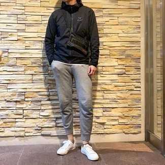 Белые низкие кедыЕсли этот день тебе предстоит провести в движении, сочетание черной ветровки и серых спортивных штанов позволит создать удобный образ в расслабленном стиле. Белые низкие кеды органично впишутся в ансамбль.