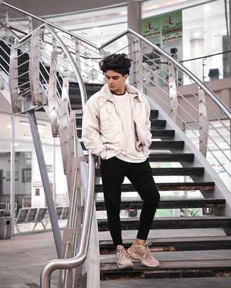 Белые низкие кедыБежевый дождевик и серые спортивные штаны — хорошая формула для создания привлекательного и несложного образа. Весьма выигрышно здесь будут выглядеть белые низкие кеды.