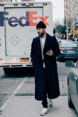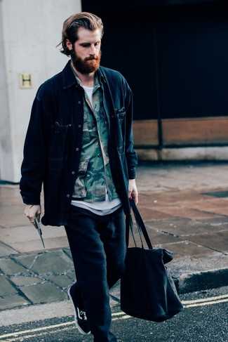 Темно-серые кроссовкиТемно-синий шерстяной пиджак и серые спортивные штаны отлично впишутся в мужской образ в повседневном стиле. Ты можешь легко приспособить такой образ к повседневным нуждам, надев темно-серыми кроссовками.