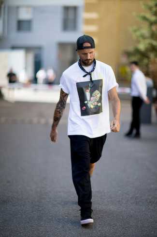 Черные низкие кедыЕсли день обещает быть суматошным, сочетание бело-черной футболки с круглым вырезом с принтом и спортивных штанов позволит создать практичный лук в непринужденном стиле. Такой ансамбль легко получает новое прочтение в сочетании с черными низкими кедами.