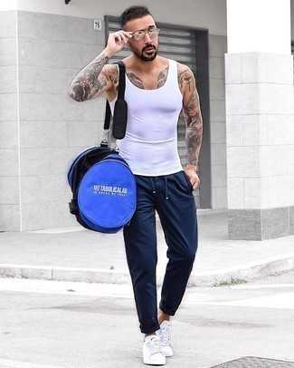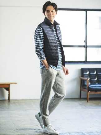 Белые кожаные низкие кедыПрактичное сочетание темно-синей куртки без рукавов и серых спортивных штанов однозначно будет обращать на себя взгляды прекрасного пола. Вместе с этим ансамблем органично выглядят белые кожаные низкие кеды.