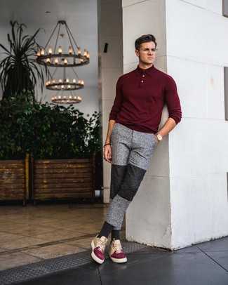 Разноцветные кожаные низкие кедыДуэт темно-красного свитера с воротником поло и серых спортивных штанов позволит составить незаезженный мужской образ в непринужденном стиле. Любишь дерзкие решения? Закончи свой ансамбль разноцветными кожаными низкими кедами.