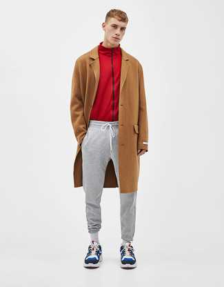 Разноцветные замшевые кроссовкиКоричневое длинное пальто и серые спортивные штаны будет хорошим вариантом для непринужденного лука на каждый день. Дополни образ разноцветными замшевыми кроссовками, если не хочешь, чтобы он получился слишком формальным.