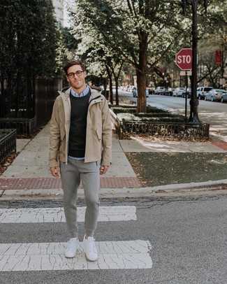 Белые низкие кеды из плотной тканиЕсли ты ценишь комфорт и практичность, светло-коричневый дождевик и серые спортивные штаны — хороший вариант для привлекательного мужского образа на каждый день. Белые низкие кеды из плотной ткани органично впишутся в образ.