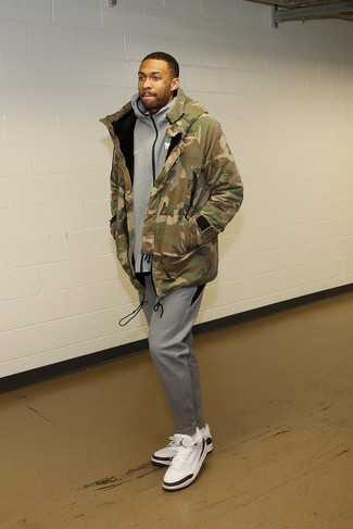 Белые кожаные низкие кедыЕсли ты ценишь удобство и практичность, оливковая парка с камуфляжным принтом и серые спортивные штаны — прекрасный выбор для расслабленного мужского лука на каждый день. Любишь эксперименты? Закончи ансамбль белыми кожаными низкими кедами.