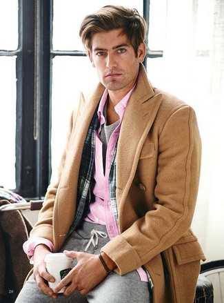 Серые спортивные штаныКомбо из светло-коричневого длинного пальто и серых спортивных штанов безусловно будет привлекать внимание прекрасного пола.