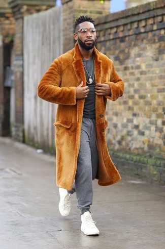 Оранжевая шубаВ оранжевой шубе и серых спортивных штанах можно пойти на свидание в расслабленной атмосфере или провести выходной день, когда в программе культурное мероприятие без дресс-кода. В тандеме с белыми высокими кедами из плотной ткани весь ансамбль выглядит очень живо.