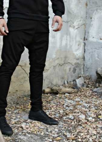 Мужские штаны-бананы свободны и округлы в бедрах, но заужены внизу с помощью отворотов штанин. В районе свободного пространства на бедрах образуются складки. Вы можете выбрать «бананы» разной длины: от классической до длины чуть ниже колена.