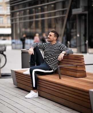Черные кроссовкиЕсли ты отдаешь предпочтение комфорту и практичности, обрати внимание на сочетание бело-черной футболки с длинным рукавом с принтом и серых спортивных штанов. Пара черных кроссовок поможет сделать образ более законченным.