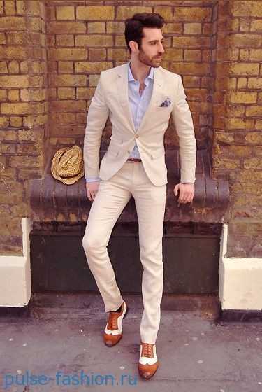 С неформальными костюмами из светлого хлопка и льна отлично смотрятся ботинки из замши и мягкой кожи на тонкой подошве. Цвет обуви также должен быть светлым.