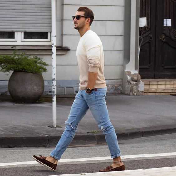 Самый простой способ выглядеть стильно-просто сочетать модные джинсы с футболкой или майкой. Обувь к такому образу можно подбирать любую: это могут быть как туфли, так и спортивная обувь-кроссовки или кеды. И не забывайте об аксессуарах. Стильные очки или хорошие наручные часы выгодно дополнят ваш образ. Весной, когда на улице ещё прохладно, отлично сочетаться с джинсами будет тонкий свитер или гольф.
