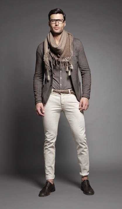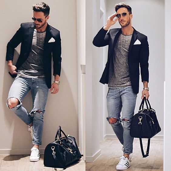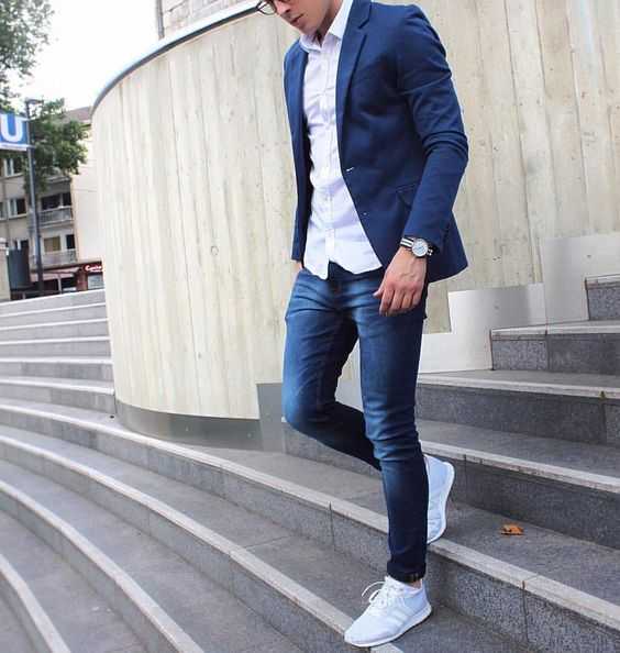 Самое классическое сочетание в мужском гардеробе-это брюки и пиджак. Мы сейчас не говорим о костюмах. В данном случае, сочетайте джинсы или хлопковые брюки в стиле casual с приталенными укороченными пиджаками или блейзером того же стиля. Причём пиджак можно надевать на рубашку, футболку или пуловер.