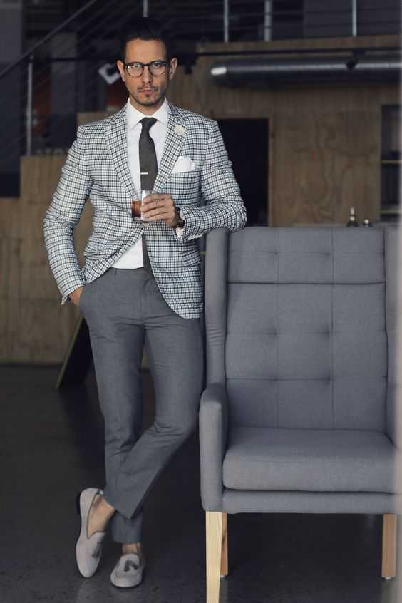 Серый цвет считается универсальным, так как прекрасно выглядит в любом исполнении, независимо от ткани. В офисе великолепно будет смотреться светло-серый костюм из фресковой шерсти, который носят с широким галстуком и карманным платком.