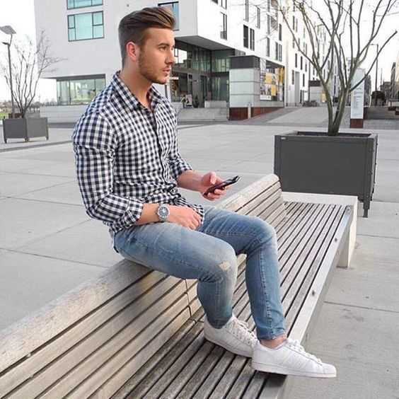 Самым простым и стильным образом станут джинсы в сочетании с рубашкой, футболкой, свитером или пуловером. Это беспроигрышный вариант. В этих вещах нельзя выглядеть плохо. Джинсы-универсальная одежда, подходящая для любого стиля одежды. В качестве обуви можно выбрать и туфли, и кеды.